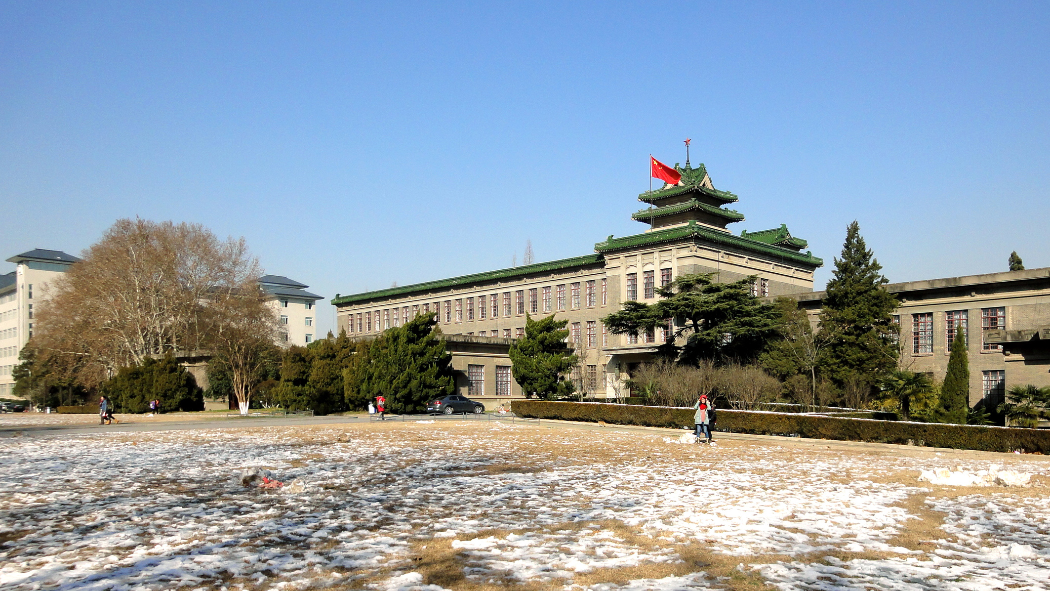 总想着有一天,一定要在操场上打一次雪仗,然而漫天飞雪在南农并不常见。偶尔一夜醒来,房屋上薄薄的一层积雪就足够让我们兴奋。没有入目的纯白,只是大雪洗刷过后的天空格外清冽,碧瓦如新,主楼顶的那颗红星跳脱出来,如此可爱耀眼。