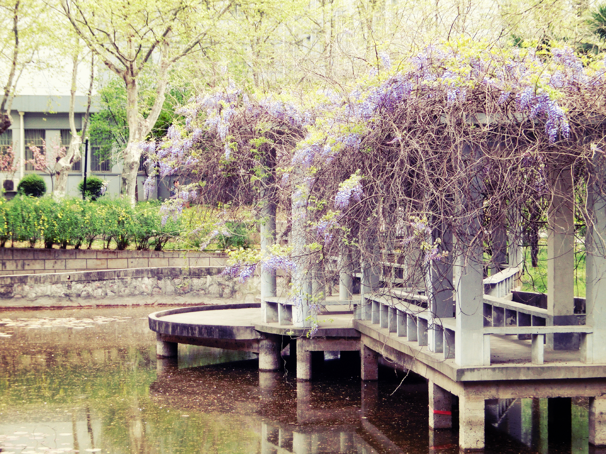 紫藤挂云木,花蔓宜阳春。曲折的回廊顶缠绕着一串串争相吐艳的紫藤,高贵清雅,临水而立,少了紫气东来的高冷,多了一份细腻的温柔,给春末夏初的校园增添了些许不同的气质。