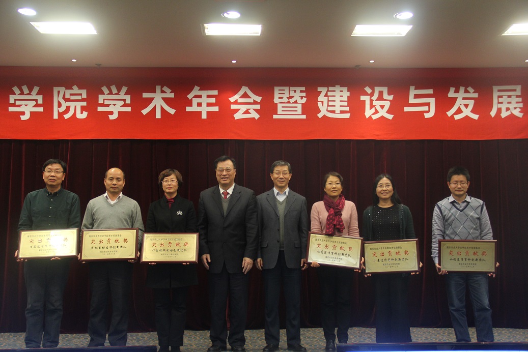 农学院1975届校友张洪程院士在水稻高产栽培理论与技术研究及水稻产业发展做出突出贡献获得杰出服务奖,水稻遗传育种创新团队、作物精确栽培创新团队、小麦遗传育种创新团队、棉花遗传育种创新团队、水稻栽培生理创新团队、大豆遗传育种创新团队等6个科研团队获得突出贡献奖,姜东、郭旺珍、吴玉峰、关雪莹、刘裕强5位教授获得杰出人才奖,王州飞、杨海水、刘小军3位青年教师因在教学、科研、推广方面做出突出成绩而获得优秀新人奖。曹卫星、翟虎渠、丁艳锋、陈佩度分别为获奖人员及团队颁奖。