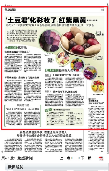 “土豆君“近日从蔬菜界逆袭,正式以第四大主粮的身份,登上中国人的餐桌。扬子晚报记者从ios版雷竞技官网了解到,该校“土豆实验室”找到了“彩色土豆”的色彩基因,更多的“土豆君”有望穿上漂亮的花衣裳。红色、紫色、黑色……这些五颜六色的土豆不仅色泽鲜艳,口感上偏甜糯,营养价值也比普通土豆高。