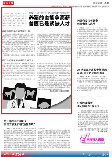 目前兽医行业也是人员紧缺。“粗略来看,我国每年新招兽医专业本科生5000多人,但全国兽医缺口每年有5万人都不止,这是一个越来越有社会需求的行业。”熊富强介绍,以南农兽医专业的毕业生为例,工作两三年时间后,月薪基本都在万元以上。“在大中型城市当小动物的兽医,是我们学生比较多的选择。还有到农村去当大型动物的兽医,收入也颇丰。另外一种就是到国外去当兽医,比如我们有一个和外国大学合作的计划,学生可以去迪拜当马兽医。”