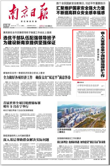 蒋宏坤对南京湿地保护工作充分肯定。他说,加强湿地保护和生态环境建设,既是经济社会发展的客观要求,也是广大人民的迫切愿望。南京对湿地保护工作高度重视,立法早、认识到位,在湿地保护方面做了很多工作,成效明显,很多做法走在了江苏前列,为制定好《江苏省湿地保护条例》提供了很好经验。他要求编制一个科学的,符合南京实际的,更有科学性、指导性和针对性的湿地保护规划,更好地做好湿地保护工作;健全湿地保护政策支撑体系,加大投入力度,尽快建立生态保护的补偿机制;把湿地保护和发展旅游业结合起来,提升经济效益和社会效益;把水环境治理作为湿地保护的重要举措,做好“水文章”,为全省湿地保护提供更多更好经验。