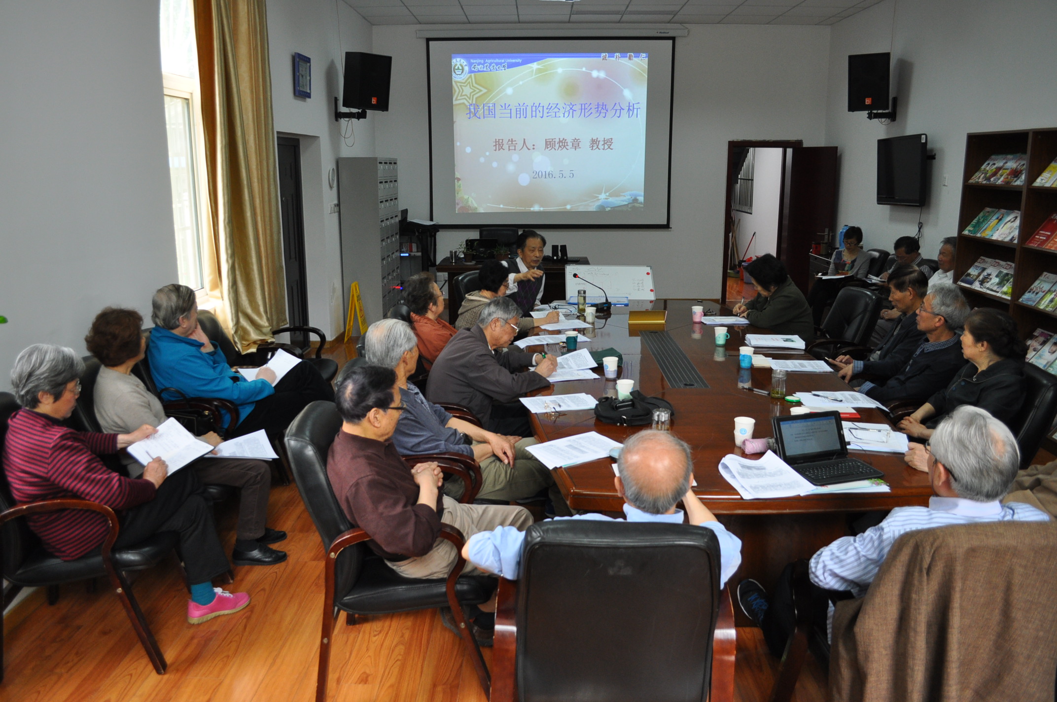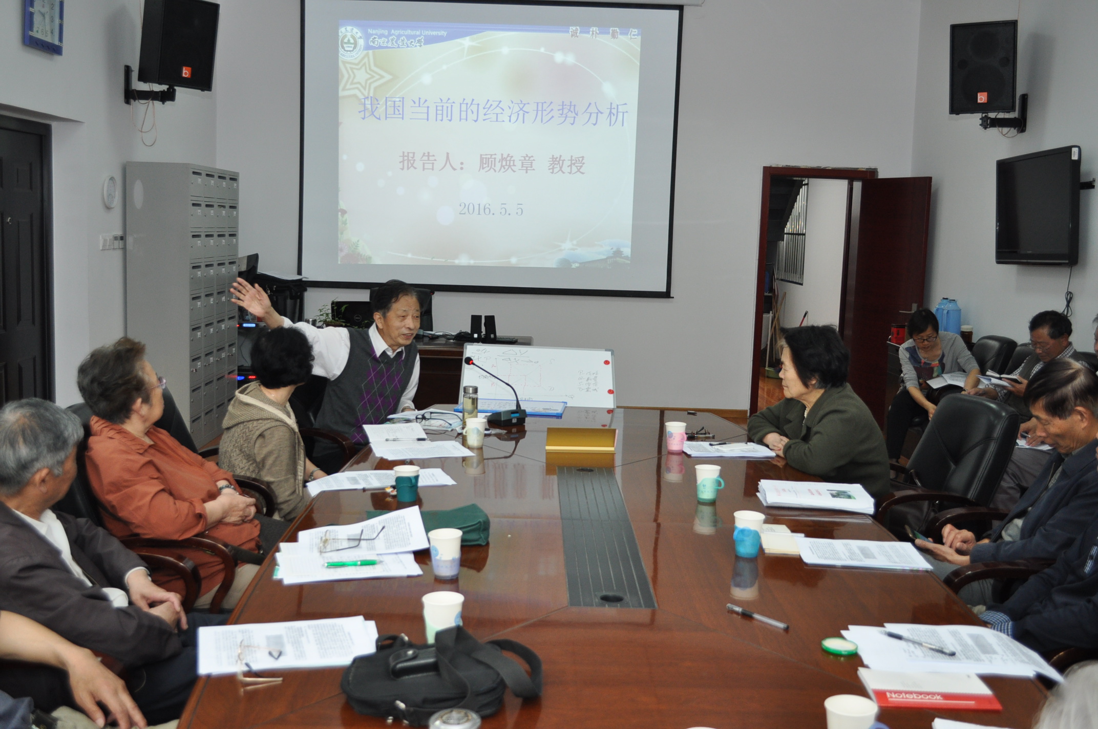 我国著名农业经济学家、江苏省十大社科名家、我校经济管理学院关工委常务副主任顾焕章教授应邀为与会老同志作“我国当前经济形势分析”专题报告。顾焕章从均衡价格、边际效应等理论分析切入主题,对当前我国的经济转型及社会分化进行了分析,重点解读了供给侧改革的五大任务:去产能、去库存、去杠杆、降成本、补短板。报告深入浅出,结合我国当前的经济形势和人们普遍关注的社会经济生活,解读了中央经济政策和决策,举例分析,针对性强,老同志们对报告内容表示欢迎,互动交流热烈。顾焕章从专业角度对老同志们提出的国有企业改革、房价走势等问题进行了解答。