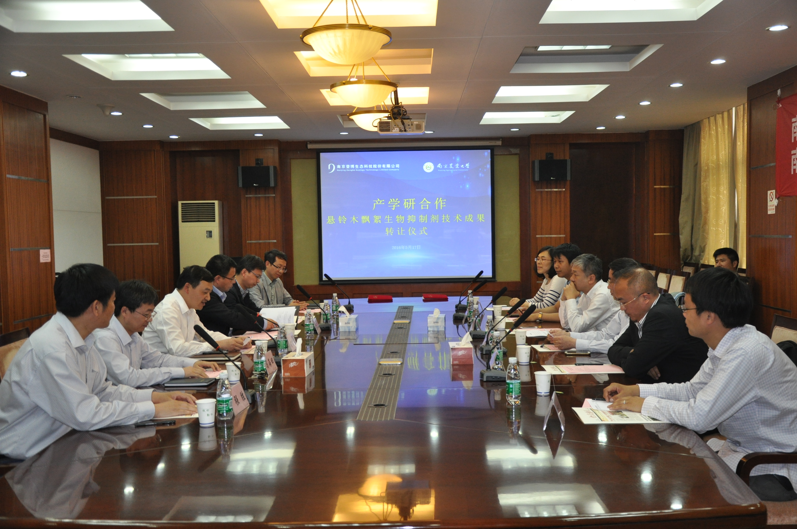 5月17日下午,我校与南京登博生态科技股份有限公司就“悬铃木飘絮生物抑制剂技术”成果转让举行了签约仪式。ios版雷竞技官网副校长董维春,科学研究院副院长俞建飞、成果与知识产权处处长姜海、产学研合作处处长马海田,生命科学学院强胜教授、副院长蒋建东以及南京登博生态科技股份有限公司董事长徐宏光、南京绿涛园林实业有限公司董事长陈凯等合作双方相关人员出席了签约仪式。签约仪式由俞建飞主持。