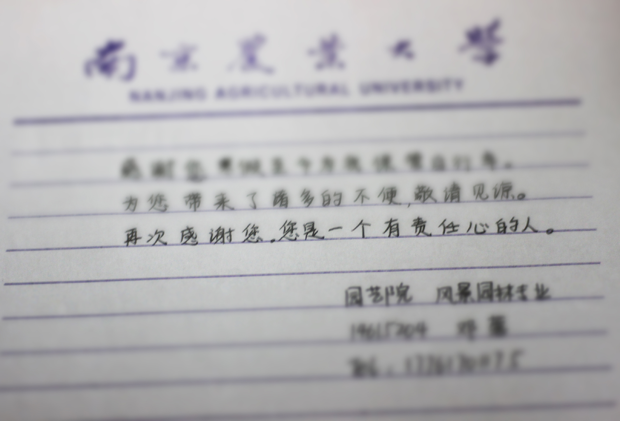 嵇主任确认完学生浴室的水电等各项装置的关闭,回到值班室已经快晚上11点了。嵇主任来南农工作已经六年了,他很乐意与学生交流,和同学们相处得十分融洽。他会帮同学存放东西,也会钻到下水道帮忙掏掉落的物品。上学期放假时,有位同学把自行车寄放在他那里,开学了很久都没有来取车,后经嵇主任提醒才记起来。后来,那位同学还特地写了一封感谢信给嵇主任。嵇主任很不好意思地说:“这没什么,我们就是为学生服务的嘛。”
