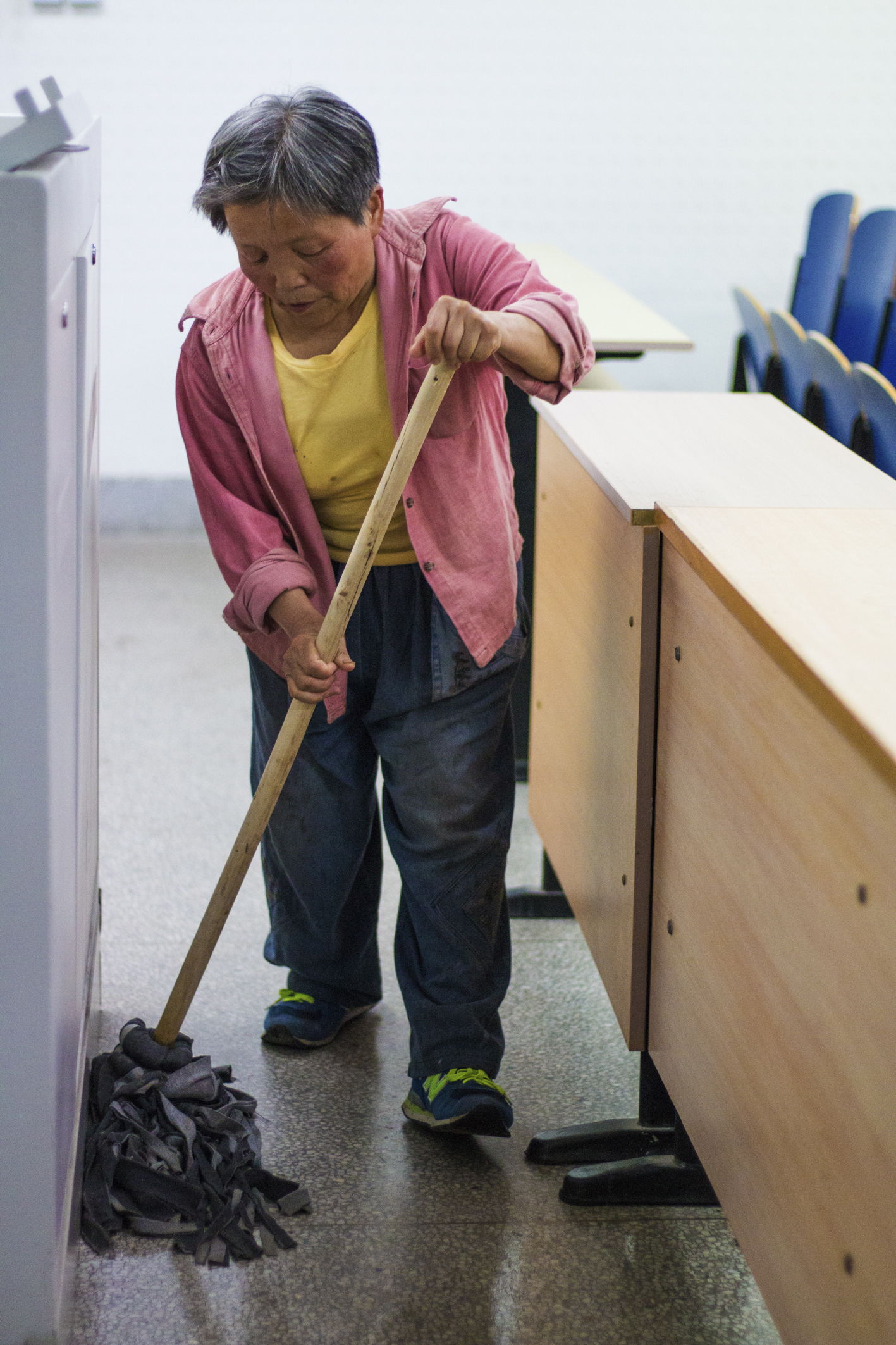 晚上9点半,袁阿姨来到教四楼打扫教室,小小的身影穿梭在桌椅之间,十分利索。袁阿姨在学校工作了18年,退休后又被学校返聘,她的工资是家里开支的主要来源。很多同学对袁阿姨的工作颇有微词,觉得她很凶。而袁阿姨认为一些同学在卫生方面不自觉,她希望学生能理解并配合自己的工作。袁阿姨常常快夜里十二点才能回到家,有时甚至要到凌晨两点才能到家。打扫时,捡到私人物品,她全都会送到教四楼的值班室。袁阿姨严肃地说:“人品很重要,没有人品就没有人格。”