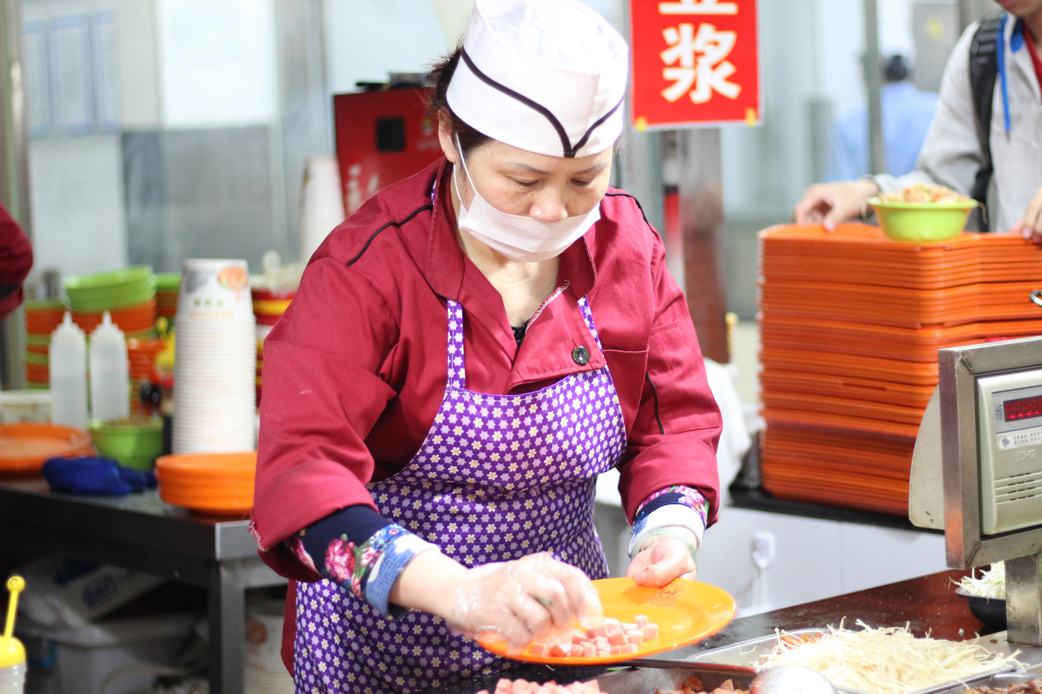 “同学,吃什么?”“几毛钱饭?”……走进食堂,各个窗口传来一声高过一声的吆喝声。窗口内,一个个穿着白衣的身影不停歇地打菜、装盘、按刷卡机。汤阿姨就是其中之一。今年50岁的她在南农工作已经五年了,每天凌晨四点半就开始投入忙碌的工作。采访时,她有些局促,红着脸说:“我们的工作很普通,没什么特别,反正就是为学生服务嘛。”