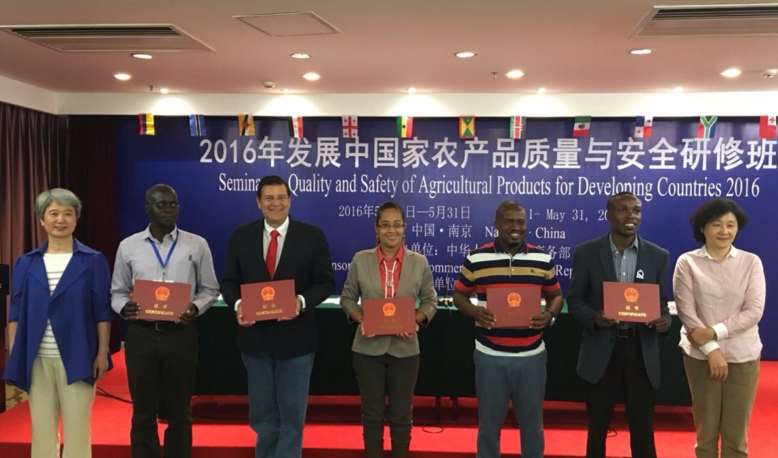 5月11日至31日,中华人民共和国商务部主办、我校承办了“2016发展中国家农产品质量与安全研修班”。副校长徐翔先后在开幕式与闭幕式上致辞 ,并为每一位学员颁发结业证书。江苏省商务厅对外经济合作处副处长赵宇虹,我校国际合作与交流处处长张红生,国际教育学院院长刘志民、副院长童敏等参加了相关活动。