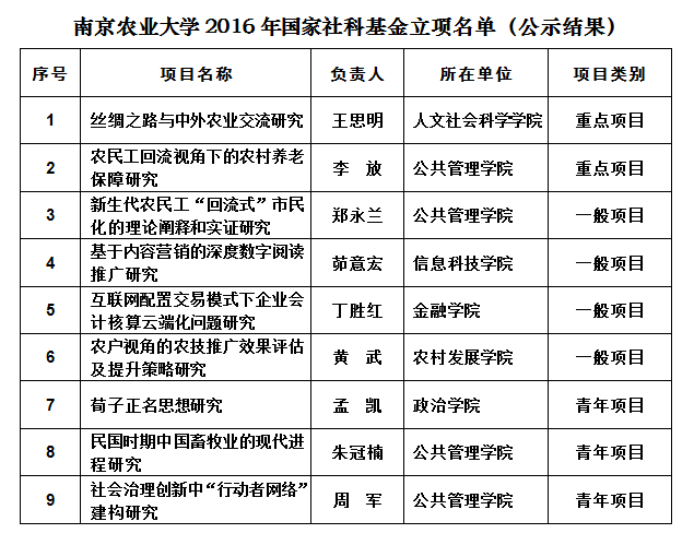 近日,据全国哲学社会科学规划办公室公示结果显示,我校2016年度国家社科基金立项总数达9项,其中重点项目2项,一般项目4项,青年项目3项。立项总数创历史新高,重点项目和青年项目立项数均居全国农林院校首位。