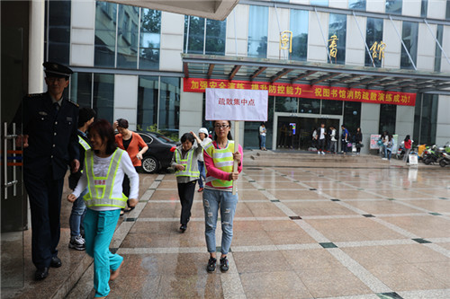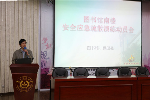 15时整,图书馆南二楼模拟起火点起火,该楼层报警按钮被按下,随后,整个图书馆火情警报拉响,保卫处救援人员在接到火警报警电话后到达现场灭火,校医院医生迅速赶往现场做医疗保障。来自图书馆各部门的工作人员立即进入应急处置状态,在各楼层担任安全引导员,组织并指引读者进行紧急逃生,安全有序地撤离至图书馆楼外安全区域。
