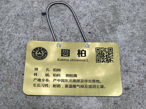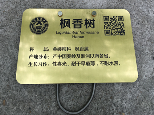 树木标示牌最终采用塑料材质,背景为金色,标牌上除树木的名称、别名、科属、产地分布、生长习性等基本信息以外,还增加了树木二维码,扫二维码便可查询该树木的详细信息。
