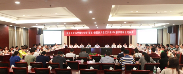 江苏省国土厅副厅长李如海,江苏省国土厅副厅长李闽,江苏省粮食局副局长朱新华,南京市农委主任方中友,江苏省农业资源开发局副局长黄非等校外兼职导师代表受邀出席。组织部部长吴群也出席了聘任仪式。19位校内导师代表、绍兴教学点、盐城教学点代表、2014级MPA春季班全体同学参加会议。