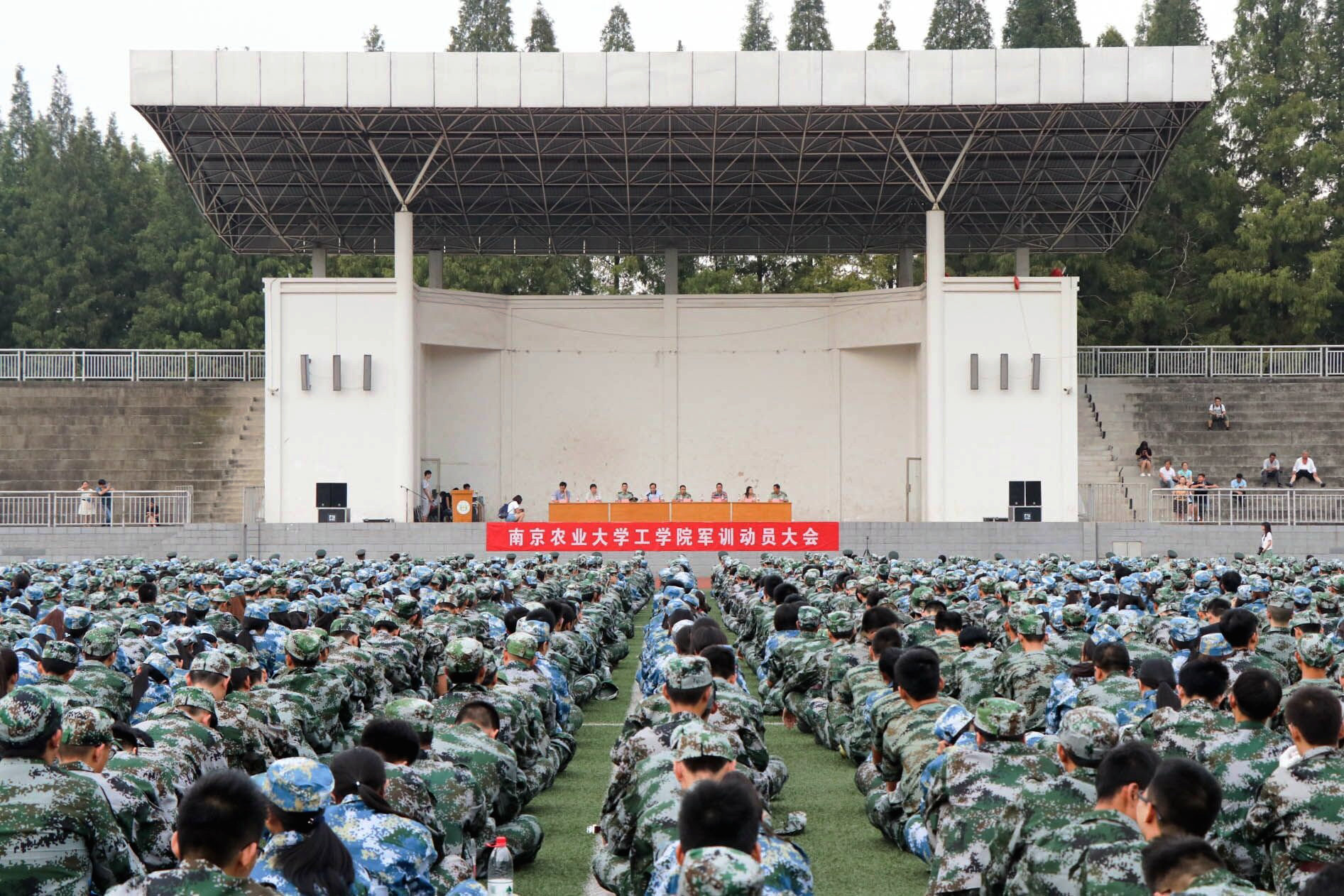 9月4日下午,工学院2016级新生军训动员大会在体育场举行。工学院党委副书记、纪委书记张兆同,学工处处长、团委书记(军训团政委)邵刚,军训团四营营长袁兵,农业机械化系/交通与车辆工程系党总支副书记李坤权,机械工程系党总支副书记罗远渊,电气工程系党总支副书记缪小红,管理工程系党总支副书记张鸣,保卫科科长(军训团参谋长)张宁励等在主席台就座。军训办公室成员、各系分管辅导员(军训团各营教导员)、军训团各营连教官、新生班主任及2016级全体新生参加动员大会。大会由邵刚主持。