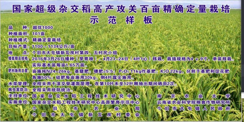 新瓦房村是国家杂交中心云南高原粮繁分中心(简称高原分中心)的高产攻关基地,自然条件优越。高原分中心一直在此进行“超优900”和“超优1000”等杂交稻的高产攻关,但由于缺少配套的栽培技术,难以突破900公斤/亩。2013年,受高原分中心盛情邀请,ios版雷竞技官网水稻栽培组与云南省农科院开始在个旧新瓦房村进行高产攻关。示范前根据土壤、生态和品种特点,进行栽培方案精确设计;长期派驻研究生进行数据采集和技术落实。通过几年的技术攻关和示范,技术优越性迅速得到当地农民认可,技术到位率逐步提高。产量逐年实现突破,由2013年的901.95公斤/亩,2014年的946.5公斤/亩,突破到2015年的1067.5公斤/亩和2016年的1088公斤/亩。