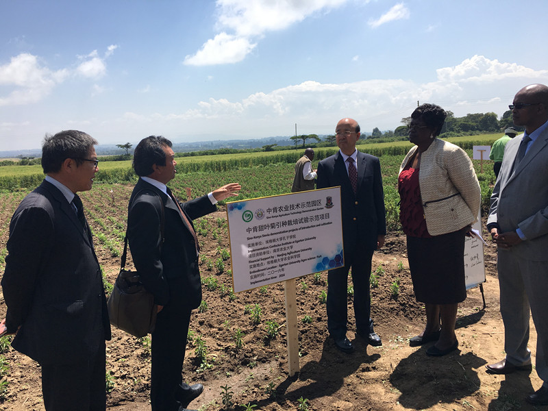 在中-肯作物分子生物学联合实验室,刘显法听取了孔子学院教师刘高琼教授关于实验室仪器设备功能和承担研究项目的介绍后,鼓励孔子学院通过引进中国先进的生物技术,把实验室建设成为面向非洲国家、尤其是东非国家高校和科研院所开放的一个实验室,将引进技术和开展合作研究结合,为改善非洲国家人民生活和缓解粮食安全问题做出积极贡献。在中-肯农业技术示范园区,刘显法听取了孔子学院教师黄海研究员关于甜叶菊引种试验和高产栽培试验的工作汇报,详细了解甜叶菊的高甜度、高安全性、高稳定性、低热量等特征和推广价值。他希望孔子学院通过引进、试验和推广新的作物品种和新的农业生产技术,在肯尼亚能形成新的农业产业,为肯尼亚民众提供就业机会,推动肯尼亚农业经济发展。