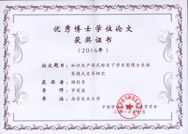 由我校罗英姿教授指导、公共管理学院博士生顾剑秀撰写的博士学位论文“知识生产模式转变下学术型博士生培养模式变革研究”获第六届中国学位与研究生教育学会优秀博士学位论文奖。 据悉,全国仅有3篇博士学位论文获得该奖项。
