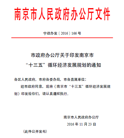 11月23日,我校于水教授课题组主持完成的项目成果《南京市“十三五”循环经济发展规划》经南京市市长签署,由南京市人民政府办公厅(宁政办发﹝2016﹞166号)颁布实施。