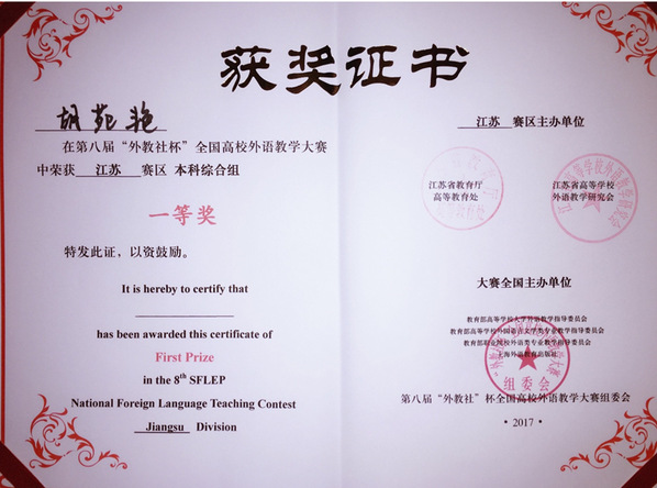 5月26日至27日,由江苏省教育厅高等教育处、江苏省高等学校外语教学研究会和上海外语教育出版社联合举办的第八届“外教社杯”全国高校外语教学大赛江苏省赛区复赛和决赛在南通大学举行。我校外国语学院教师胡苑艳代表学校参赛,并以本科综合组总分第一的成绩获得一等奖。这是我校教师连续第三次在江苏赛区获得一等奖。同时,胡苑艳还获得本科综合组“最受学生欢迎的老师”称号。