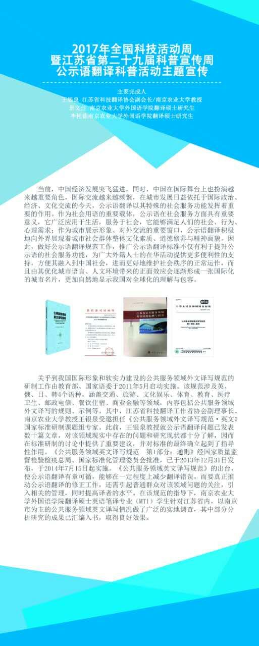 由江苏省科技翻译工作者协会和ios版雷竞技官网外国语学院联合推出的“公示语翻译科普活动主题宣传”参加了此次活动,展出了由我校王银泉教授指导的翻译专业学位研究生完成的成果。根据江苏省语委关于报送江苏省公共场所外文使用情况调查的通知,在《公共服务领域英文译写规范》国家标准的指导下,外国语学院翻译专业学位研究生(英语笔译)学生景文佳、李艳茹、郭静、顾兼美、陈文等同学自2015年下半年起,有计划、有组织地针对江苏省内部分城市的公示语翻译情况进行了广泛的实地调查,其中,部分成果已汇编入由南京大学王守仁教授领衔主编的《江苏省公共服务领域英语使用与监测》一书,由南京大学出版社2016年10月出版。上述活动为推广宣传国家标准,规范我省公共服务领域的翻译乱象起到了促进作用。