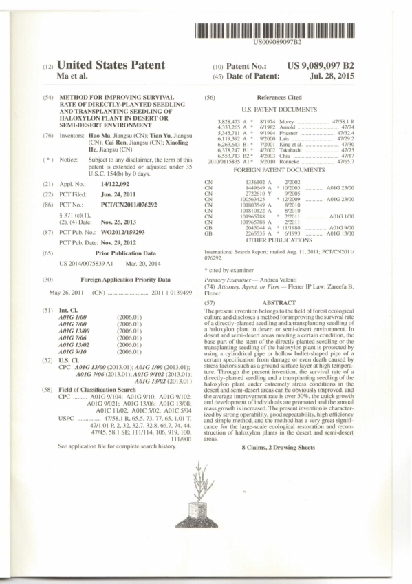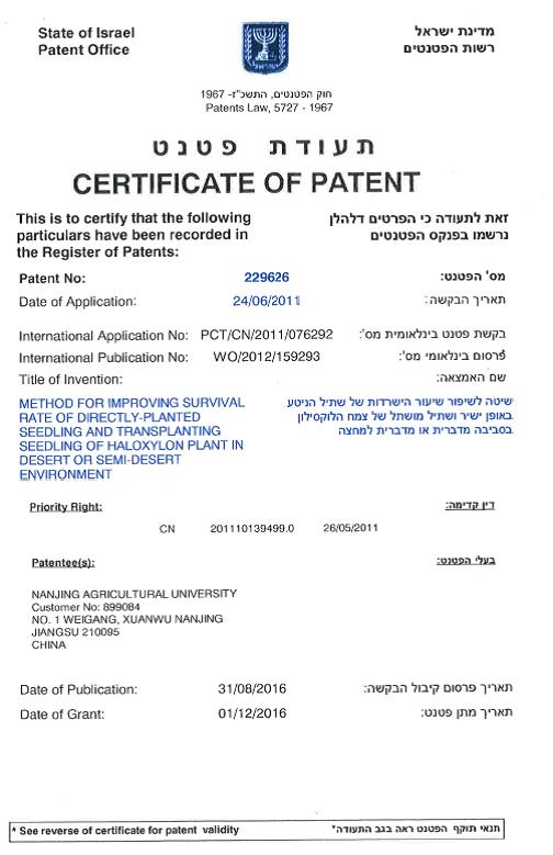 近日,由我校麻浩教授所率科研团队经10多年潜心研究发明的“免灌溉管件防护荒漠造林技术”在获得多项中国国家发明专利和实用新型授权的基础上,又分别获得世界科技最发达国家美国和荒漠化防治领头羊国家以色列发明专利授权,为该荒漠化防治技术利器走上国际市场奠定了基础。