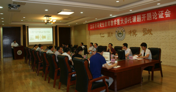江苏省教育厅副厅长洪流、教育厅研究生教育处处长、省学位办主任杨树兵、省科技厅科技机构与条件处副处长任志宏、省教育厅研究生教育处副主任科员沈春出席会议。应邀出席论证会的专家还有:扬州大学副校长俞洪亮、东南大学研究生院副院长袁榴娣、南京天邦生物科技有限公司常务副总经理苏雅君、中国电子科技集团公司第二十八研究所国防重点实验室总工程师丁峰,我校研究生院常务副院长侯喜林以及课题组部分成员参加了会议。论证会由杨树兵主持。