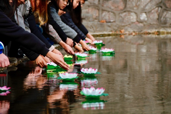 现场的同学们纷纷响应号召在“铭记历史,勿忘国耻——南京大屠杀国家公祭日悼念活动”横幅上签名,在纪念卡片上写下对祖国的祝福和对和平的期许,并将祈愿和平的花灯放入池塘寄托对逝者的哀思。