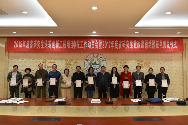 会议首先进行了2017年度省研究生教育教学改革研究课题结题证书颁发仪式,侯喜林宣读了结题课题名单,董维春依次为课题负责人颁发了结题证书并集体合影留念。2017年度省教育厅批准我校12项课题结题,课题项目负责人分别为程伟华、高学文、郭忠兴、侯喜林、黎星辉、林国庆、王昱沣、吴虹雁、徐梦洁、薛金林、张阿英、张桂荣。学校于2017年对结题项目实施了教学工作量补助奖励政策。