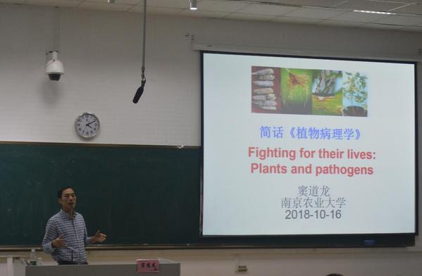 本次讲堂由植保院教授窦道龙主讲《简话<植物病理学>》,旨在激发同学们对植物病理学科兴趣。窦道龙以Fighting for their lives: Plants andpathogens为题,用拟人化的语言,将植物与病原物在漫长的进化过程中的艰难生存斗争娓娓道来。从植物病害的概念、病原物和致病途径、植物的抗病过程和病害控制方法,到“植物医生”的职业定位和重要价值,窦道龙由浅入深,向大家做了准确详细的介绍。
