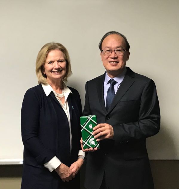 访问密西根州立大学期间,该校教务长(常务副校长)June Youatt和副教务长Steven Hanson 等会见了代表团一行。Youatt表示,南农大是密州大在中国最重要的合作伙伴之一,感谢南农大一直以来为积极推进两校高层次学术交流与合作所做的贡献。两校联合学院筹建工作取得重大进展,即将步入正式实施阶段。希望双方继续加强合作,把联合学院建成高水平校际合作的示范项目。周光宏表示,密州大与南农大在农业及相关领域实力相当,目标一致,合作前景十分广阔。两校共建联合学院,倾力打造人才培养与科研合作的高地,必将为中美两国和世界农业发展做出贡献。随后,双方探讨了联合学院申报阶段专家评议会的准备工作和“亚洲农业研究中心”下一步工作计划。密州大中国办公室主任JiaguoQi参加会见。