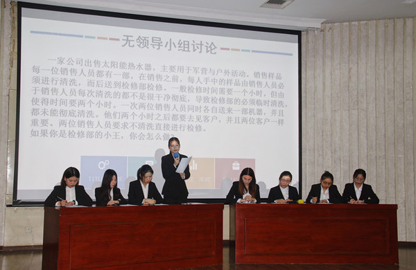 接着,在无领导小组讨论环节由主持人给出题目,参赛选手在规定时间内审题并草拟发言提纲后,进入小组成员讨论环节,成员依次阐述自己的观点。紧接着开始小组内的自由讨论,在组内达成统一意见后,派选出一名代表总结陈词,向考官报告讨论情况和结果。在小组讨论环节,成员各抒己见,有理有据,思想不断碰撞交流,讨论气氛十分活跃。讨论结束后,评委们根据场上选手的综合表现打分并点评。