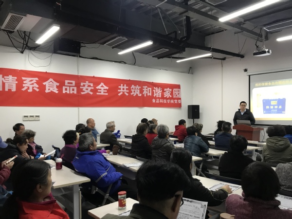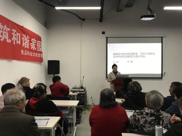 食品院孟凡强博士从防范保健食品骗局、假保健品危害及中老年人常见疾病预防等方面进行介绍,帮助中老年人正确认识保健品,了解健康的养生方法。乔家驹博士从食品安全小常识、伪劣产品的判别、实物中毒的原因及果蔬农药残留的去除等对食品安全防范的知识进行讲解,让老年人了解了常见的食品安全误区,学习更科学的食品安全预防措施。