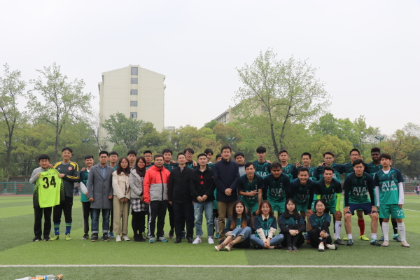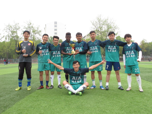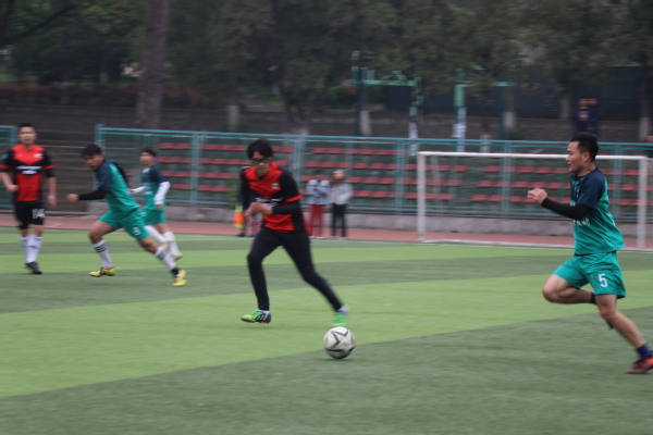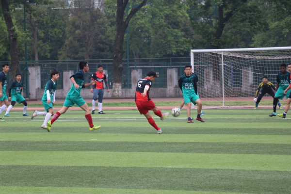 比赛开始前,公管院球员们互相加油鼓励,声音响彻球场,向所有人昭示着他们的夺冠的决心。随着主裁哨声一声令下,双方开始了激烈而胶着的争夺对抗。比赛伊始,双方就互相按照既定战术冲击对方。稍稍试探几个回合后,公管院袁子坤同学禁区左侧接球射门,对方门将措手不及。公管院早早取得领先优势。随后双方在中场展开激烈争夺,都打出了极具威胁的进攻。二十分钟左右,教职工队卢茂春获得单刀机会带球冲入禁区,但是在公管院队长汤宸凯的防守干扰下射门质量不佳被门将没收。后来公管院在对方半场持续控球,袁子坤在大禁区外围接球后晃过对方后卫,起脚远射打入世界波。公管院在上半场确立了两球领先的优势。易边再战,随着体能下降,双方在各自阵型上都做出一定的人员变动。公管院出色的中场拦截也终于收到了成效。比赛第55分钟,公管院左路得球,无人贴防的袁子坤左路稍作调整起脚爆射,球打到对方后卫的身上变线入网,比分变为3:0。不久后,阿里木禁区内被侵犯,主裁判汪瑜辉判罚点球,马龙飞一蹴而就扩大比分。