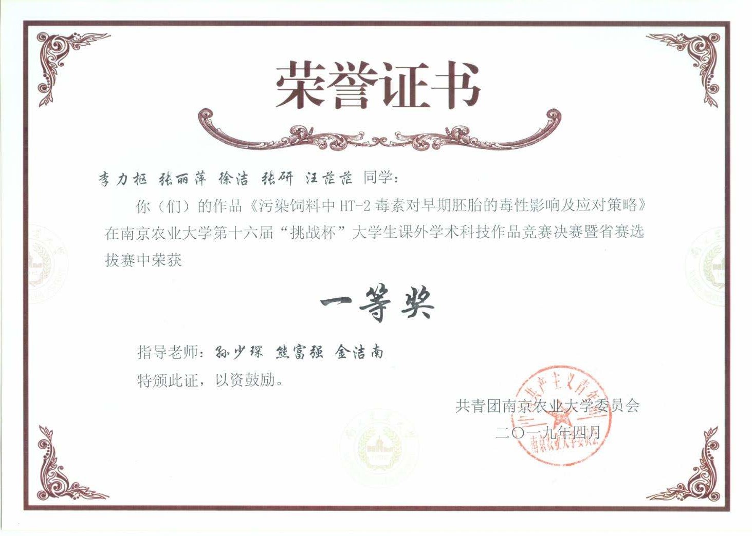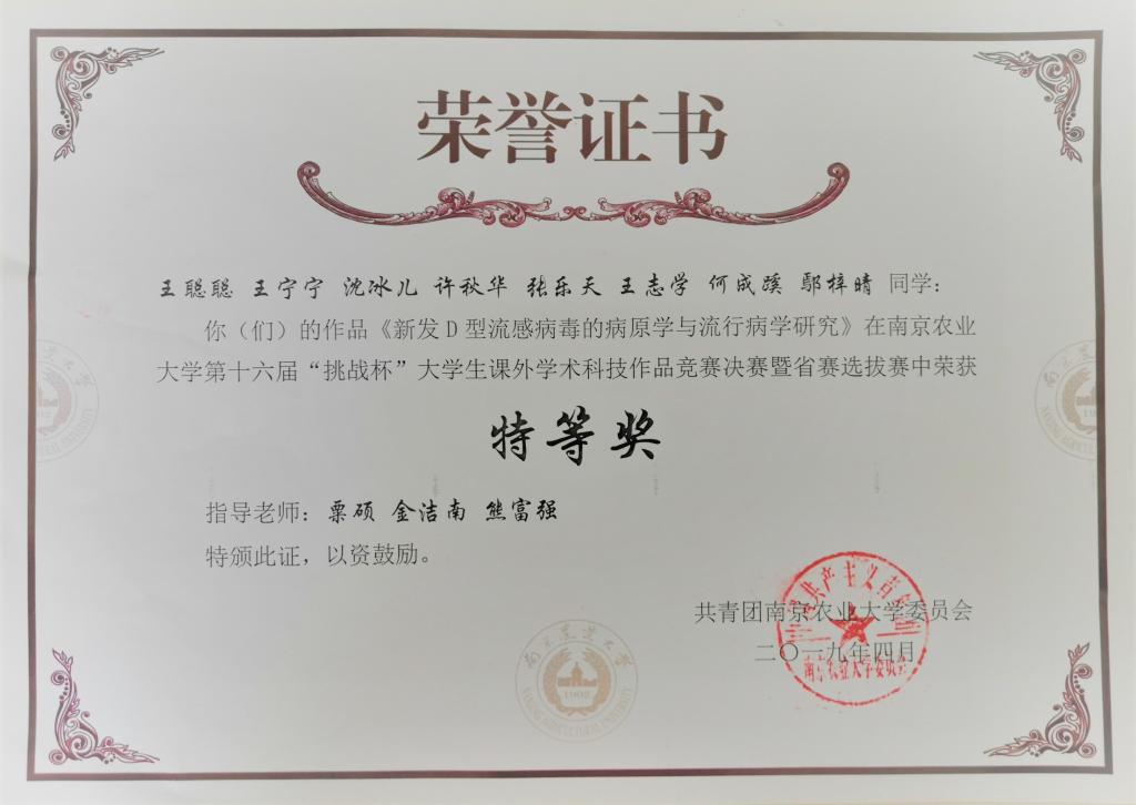 此外,《新发D型流感病毒的病原学与流行病学研究》、《污染饲料中HT-2毒素对早期胚胎的毒性影响及应对策略》、《一种增强仔猪免疫功能的富硒产还原型谷胱甘肽复合菌制剂研发》三个项目成功进入省赛,将于5月24日-26日参加江苏省省赛决赛。