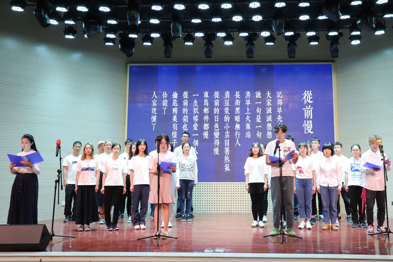 本次合唱比赛中,设计者依据每首歌的背景别出心裁地将歌名串烧成三个故事,将14首参赛歌曲分到三个篇章进行:第一篇章——星芒万里;第二篇章——星河共影;第三篇章——星船清梦。我院器乐团、合唱团以及朗诵节目穿插在各章节的间隙,微信墙“线上打call”贯穿始末。比赛过程可谓“八仙过海,各显其能。”那厢你方弹罢,余音绕梁;这厢我方登场,歌声动听。