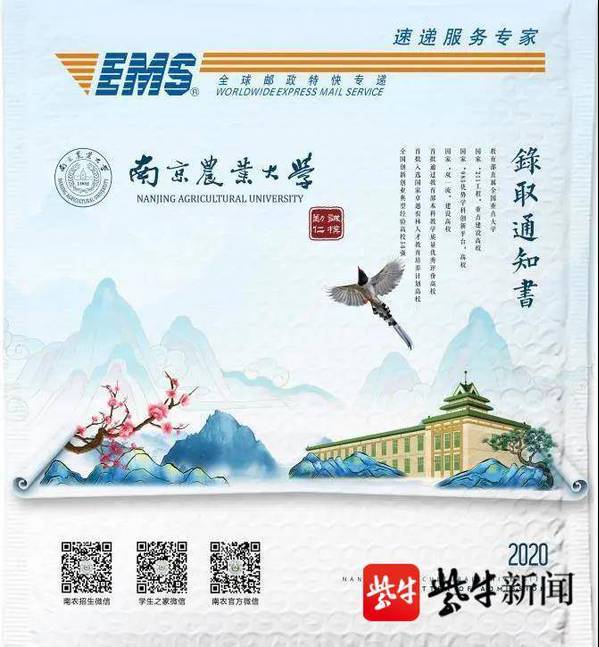 不仅录取通知书惊艳,就连EMS包裹封面也让人惊喜,记者看到,封面紧扣“揽得钟山绿 播作神州春”主题,选用钟山、主楼以及南农校园常见的“报喜鸟”红嘴蓝鹊、梅花等元素,既寓意着百年名校喜迎新的勃勃生机,也蕴含着对考生“金榜题名、喜上眉梢”的真切祝福。