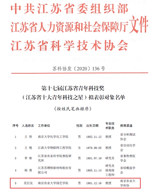 日前,第十七届江苏省青年科技奖暨“江苏省十大青年科技之星”获奖名单揭晓,我校园艺学院吴巨友教授荣获江苏省青年科技奖暨“江苏省十大青年科技之星”称号。