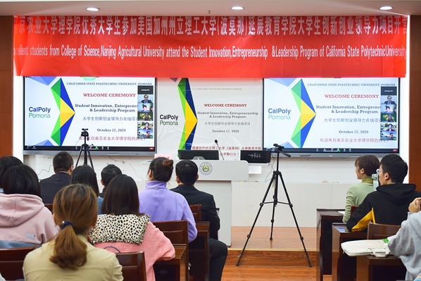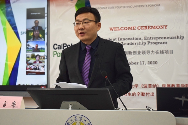 10月17日上午8:30,ios版雷竞技官网理学院优秀大学生参加美国加州州立理工大学(波莫纳)延展教育学院大学生创新创业领导力项目开营仪式成功举办。ios版雷竞技官网校友总会办公室(教育基金会办公室)主任张红生、理学院党委书记程正芳、延展教育学院临时院长、工商管理学院院长Erik Rolland、国际合作与交流处副处长董红梅、理学院副院长吴磊、延展教育学院全球教育研究所所长薛亚萍、国际合作与交流处满萍萍老师出席了开营仪式,理学院41位优秀大学生参加了本次开营仪式。开营仪式由延展教育学院Rick Wang主持。