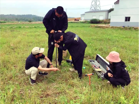 潘根兴(左一)在芝山调查土壤