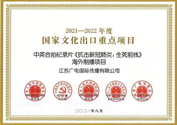 近日,江苏广电国际传播有限公司制作的中英合拍纪录片《抗击新冠肺炎:生死前线》海外制播项目,经商务部、中宣部、财政部、文化和旅游部、广电总局五部委联合评选认定,正式入选2021-2022年度国家文化出口重点项目。我校外国语学院王银泉教授为《抗击新冠肺炎:生死前线》提供解说词的翻译和审定。