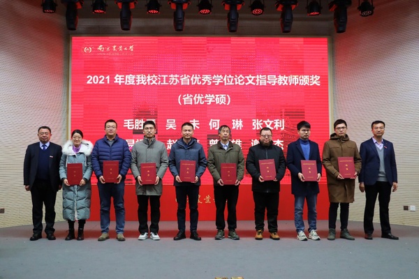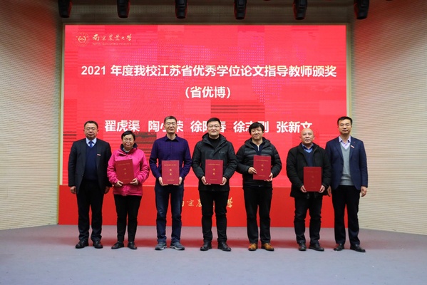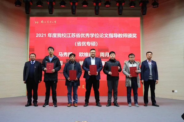2021年度我校获得5篇江苏省优秀博士学位论文,8篇江苏省优秀学术学位硕士学位论文,6篇江苏省优秀专业学位硕士学位论文,研究生工作部部长姚志友宣读了获奖指导教师名单,经济管理学院博士生导师徐志刚教授代表获奖导师发言。