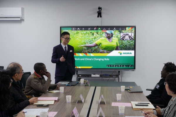 聘任仪式结束后,程诚作了题为《基础设施与非洲的经济增长:全球视野下的农业开发新时代》的英文学术报告,五十余名中外学生和相关教师通过线上线下的形式参加。程诚首先介绍了非洲农业绿色革命联盟的愿景、使命、在缓解非洲粮食安全方取得的成绩,以及与中国合作助力非洲农业发展的相关工作。阐述了非洲基础设施建设历史和现状、中非合作模式的特色及成果、“一带一路”倡议为促进非洲经济繁荣做出的贡献。