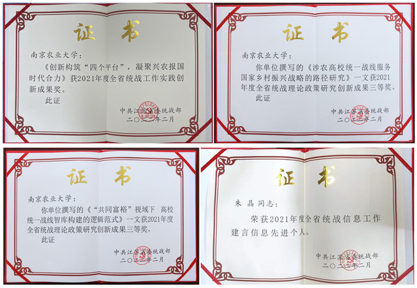 学校统一战线《创新构筑“四个平台” 凝聚兴农报国时代合力》荣获“全省统战工作实践创新成果”奖。《涉农高校统一战线服务国家乡村振兴战略的路径研究》和《“共同富裕”视域下高校统一战线智库构建的逻辑范式》荣获“全省统战理论政策研究创新成果三等奖”。全国人大代表、民盟盟员朱晶教授荣获“全省统战信息工作建言信息先进个人”称号。