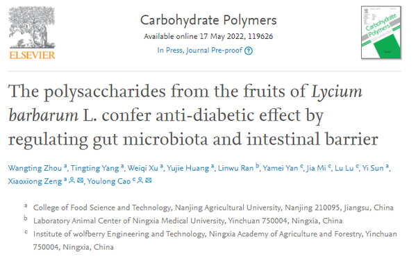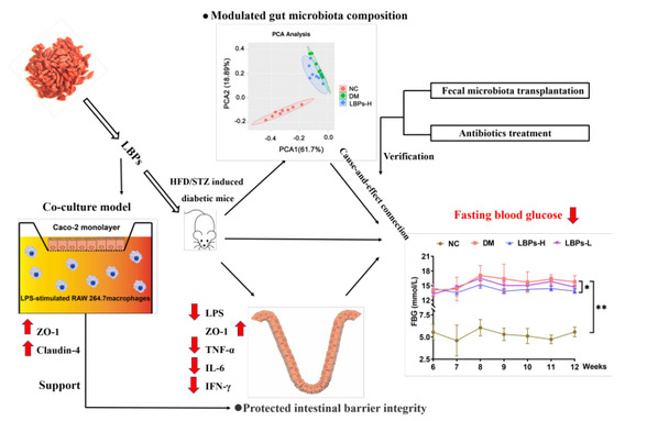 近日,我校食品科技学院曾晓雄教授课题组与国家枸杞工程技术研究中心曹有龙研究员团队合作在Carbohydrate Polymers发表了题为“The polysaccharides from the fruits of Lycium barbarum L. confer anti-diabetic effect by regulating gut microbiota and intestinal barrier”的研究论文。该研究采用粪菌移植和伪无菌小鼠技术,并结合体外肠道单层细胞和巨噬细胞共培养模型,阐明了枸杞多糖重塑肠道菌群紊乱和改善肠上皮屏障功能的潜在降血糖作用机制。同时,该研究也是该课题组近年来围绕枸杞多糖与肠道微生物相互作用及其健康效应研究在International Journal of Biological Macromolecules (2019)、Food & Function (2019)和Food Research International (2021)等刊物上发表相关成果后的又一重要进展。