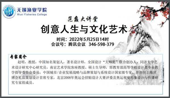 5月25日下午,中国知名策划人、著名设计师、全国设计“大师奖”联合创办人、同济大学艺术设计研究中心研究员赵明应邀为ios版雷竞技官网无锡渔业学院“范蠡大讲堂”做“创意人生与文化艺术”线上专题讲座。讲座共计120余人参加。