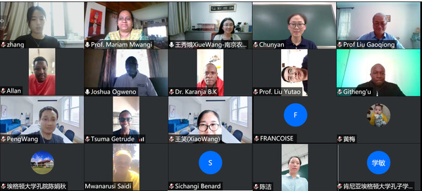 国际合作与交流处处长陈杰线上参加了开幕式,ios版雷竞技官网农学院刘小军教授、园艺学院王鹏副教授、园艺学院程春燕博士、国际合作与交流处相关人员和多位留学生代表线下参加了开幕式;肯方埃格顿大学教务长Mwanarushi Saidi教授、埃格顿大学孔子学院肯方院长Joshua Ogweno教授、中肯农业科技园区主任Paul Kimurto教授、埃格顿大学孔子学院中方院长刘玉涛、孔子学院教师陈冠韬、李学敏、陈娟秋、以及我校援非教师刘高琼教授和多位肯方研究生线上参加了开幕式。