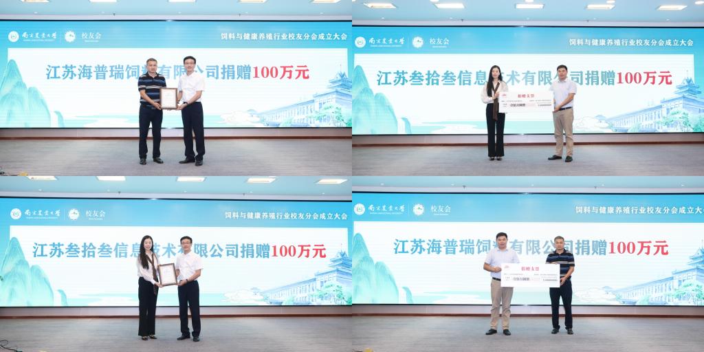 校友代表江苏海普瑞饲料有限公司董事长强发旗、江苏叁拾叁信息技术有限公司董事长张梓强分别向动物科技学院捐赠教育基金100万元。胡锋为强发旗、张梓强颁发捐赠证书,并合影留念。
