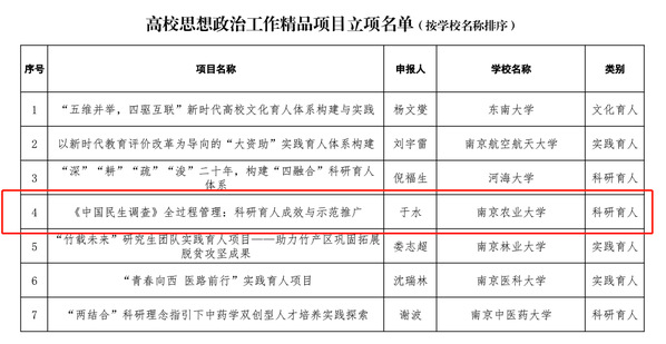 近日,江苏省教育厅公布首批江苏高校思想政治工作质量提升工程有关建设项目遴选结果,我校公共管理学院于水教授申报的《<中国民生调查>全过程管理:科研育人成效与示范推广》项目获批高校思想政治工作精品项目立项。