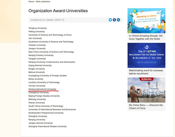 1月12日,中国日报社与中国银行“我·中国和这十年”主题征集活动评选结果揭晓。我校动物医学院外籍专家Chang Cai(蔡畅)博士的文章《China's golden decade》和资环学院外籍专家Alexandre Jousset博士的文章《The best of ten years working hand in hand with NJAU scientists》分别荣获二等奖,我校荣获优秀组织奖。