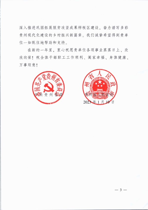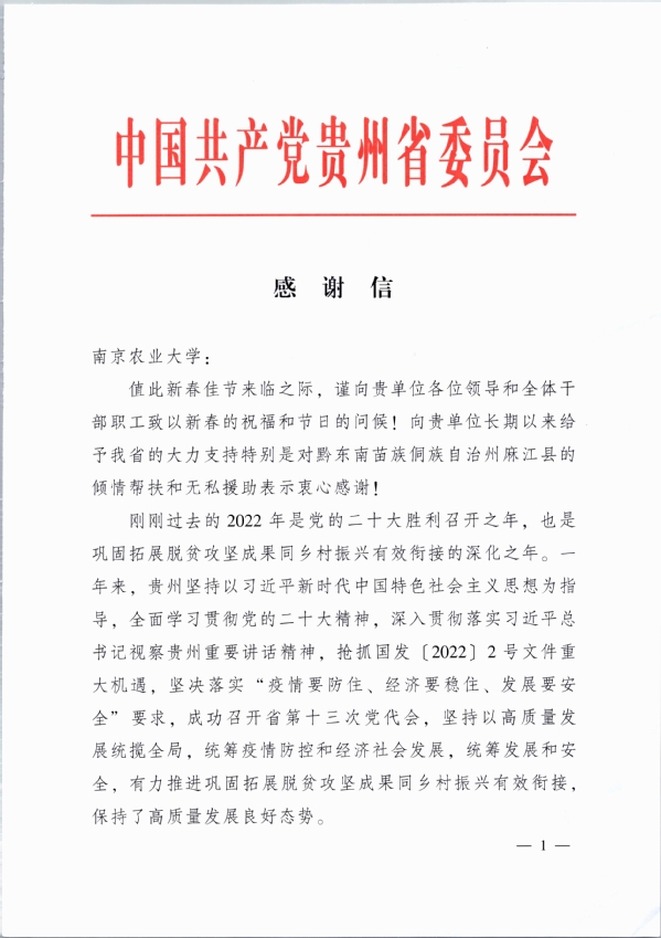 春节期间,中共贵州省委、贵州省人民政府再次向我校发来感谢信,来信向ios版雷竞技官网长期以来给予贵州省的大力支持特别是对黔东南州麻江县的倾情帮扶和无私援助表示衷心感谢。
