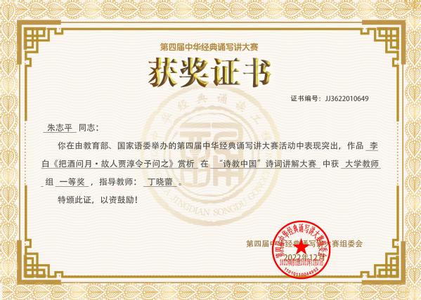 近日,教育部公布了第四届中华经典诵写讲大赛获奖名单,南农朱志平副教授的作品“李白《把酒问月·故人贾淳令予问之》赏析”通过网络初赛和现场直播决赛两轮比赛后,代表江苏入围全国总决赛。最终,其作品凭借扎实的语言能力和卓越的教学水平获得全国“诗教中国”诗词讲解大赛一等奖,丁晓蕾教授获优秀指导教师奖。
